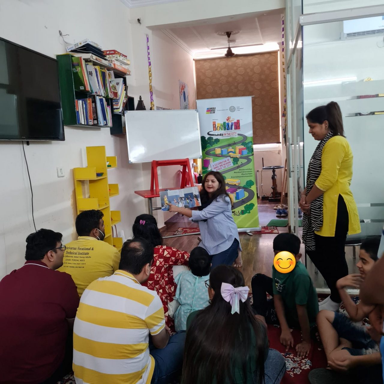 The audience at the Parivartan Vocational and Technical Centre was a mixed bag of varying age groups with autistic spectrum disorder. When storyteller Astha Chadha visited the centre, she started her session with introductions so that the audience can warm up and listen to her attentively. Astha assigned every member of the audience a character from the story to familiarise them and give a sense of relatability. They even danced like the kids in the story. The colours brought along by Astha fascinated one of the kids, who couldn’t wait to use them. Astha invited the children one-by-one to draw any thing that they would want to see up in the night sky. And the results were a colourful collage of contrasting things; some drew stars, some drew faces, one kid drew a cat, one drew an elephant with five legs and four tails. With a growing sense of comfort, the children in the audience shared their favourite movies and songs. The session opened up a space for communication and bonding, which was the highlight of the day.